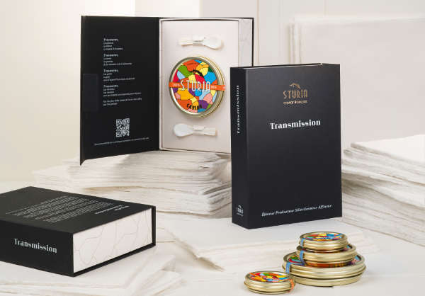 Le Coffret Transmission raconte une histoire, pensé comme un livre, dans un écrin unique. Il ne renferme pas seulement du caviar, mais l’histoire de quatre acteurs essentiels qui incarnent l’art du précieux grain : le pisciculteur, le commerçant, le chef et le consommateur. Quatre maillons, quatre savoirs qui se passent de mains en mains, de génération en génération. Chaque détail du coffret raconte cette histoire de transmission, illustrée par des textes soigneusement apposés en quatrième de couverture. Imaginé dans le respect de l’environnement, le coffret est fabriqué à partir de matériaux 100% recyclés, provenant de France, d’Espagne et d’Italie. Son design épuré renfermera une boîte de caviar Sturia (15g, 30g, 50g, 100g ou 125g au choix), accompagnée de deux cuillères en nacre et d’un gel pack pour une conservation optimale des grains.