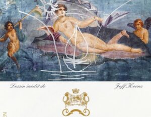 Pour Mouton-Rothschild, l’artiste choisit de revisiter l’Antiquité. Avec comme base une fresque de Pompéi, « la Naissance de Vénus », Jeff Koons a balayé la reproduction de la fresque d’un trait argenté, la transformant ainsi en Vénus au Vaisseau. C’est ainsi que l’on retrouve, pour dessin, un navire voguant sur l’océan, sous un clair soleil. Le vin doit être exquis.